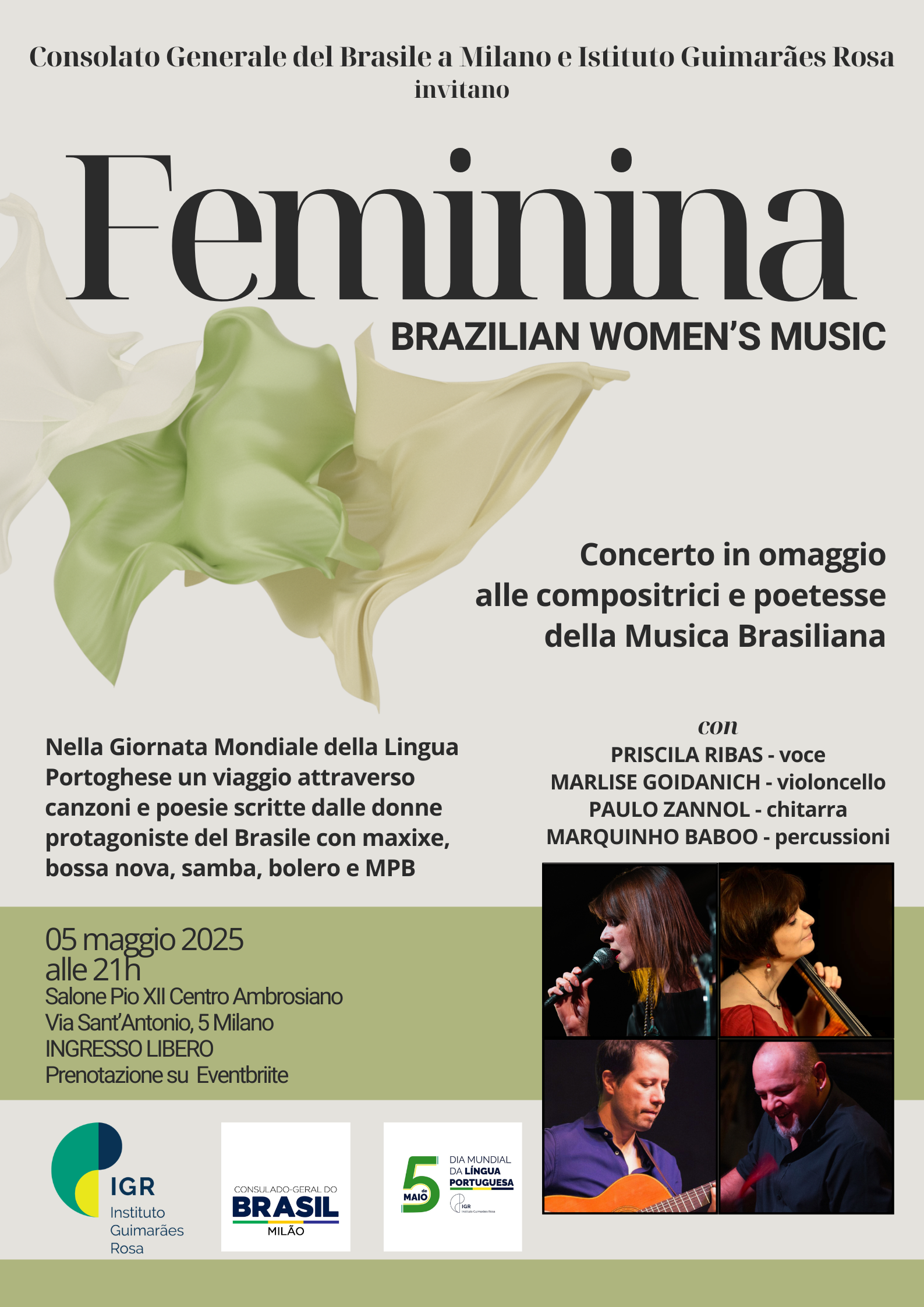 Lunedì 5 Maggio 2025 alle h. 21.00 Casa Schuster ospiterà ” Feminina” un concerto in omaggio alle compositrici e poetesse della Musica Brasiliana