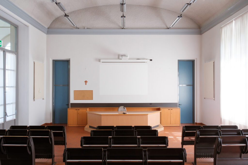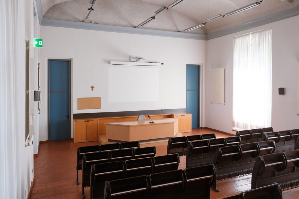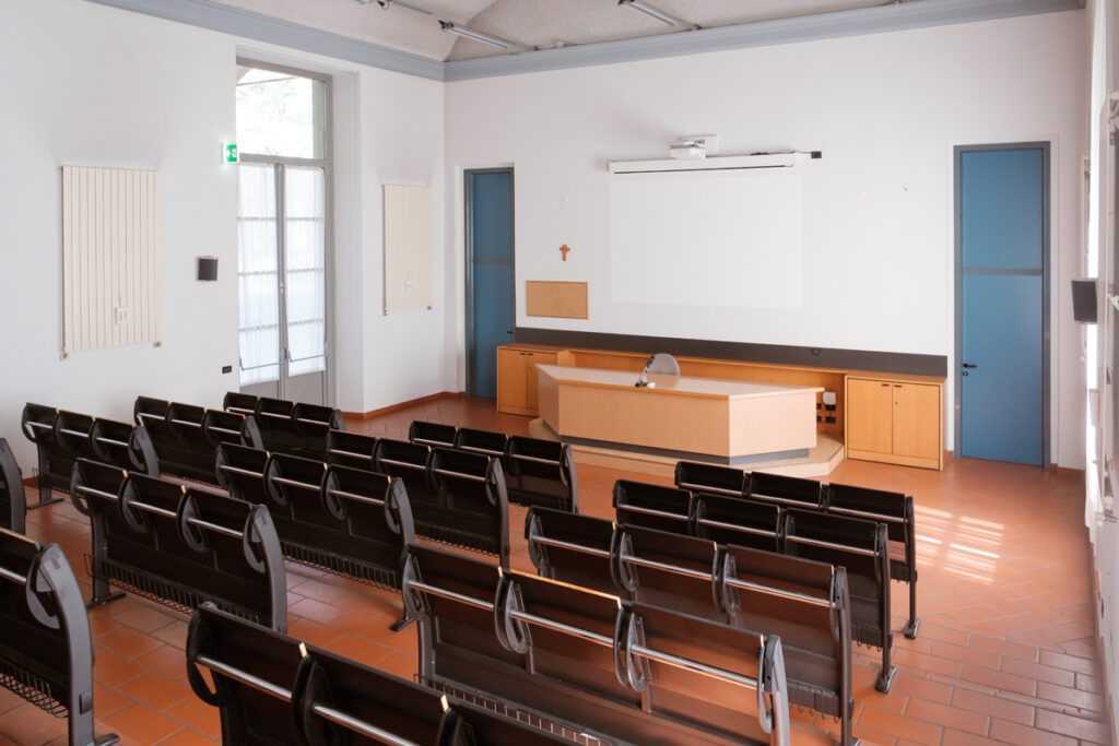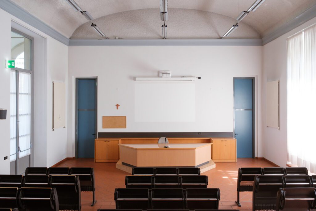 Videoproiettore a soffitto e impianto audio. Scrivania relatore con microfono fisso