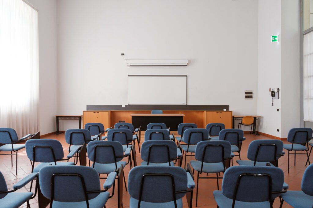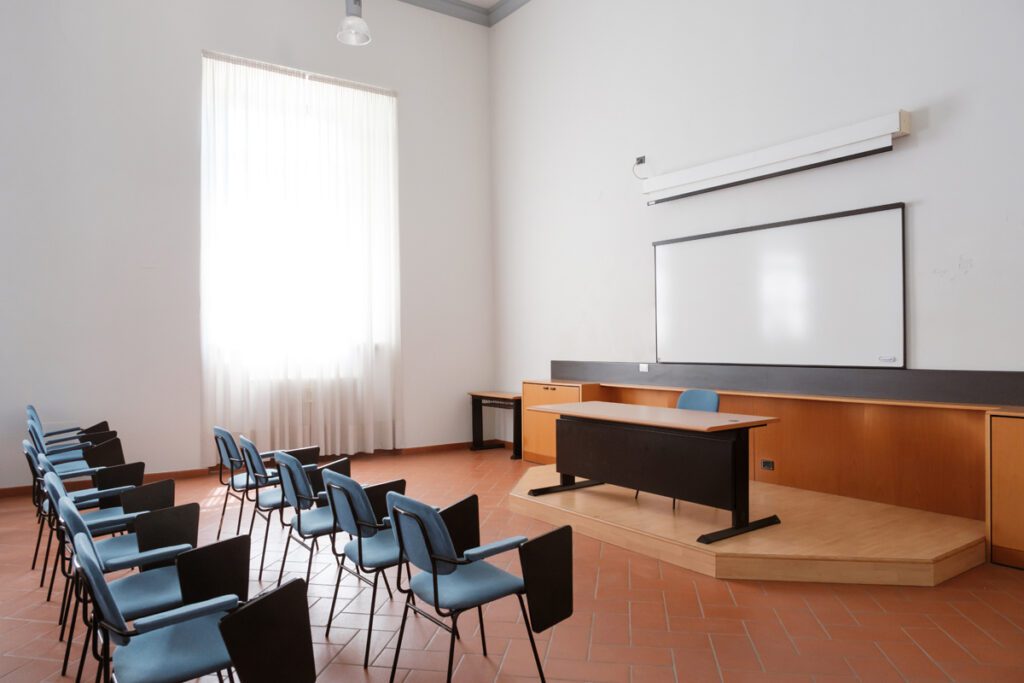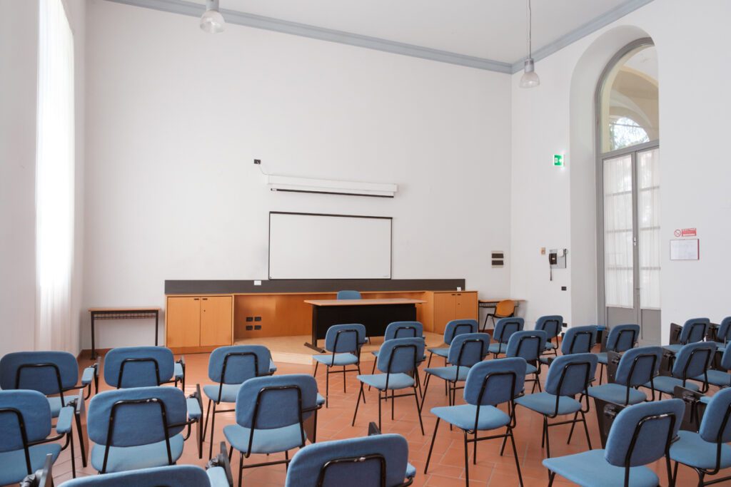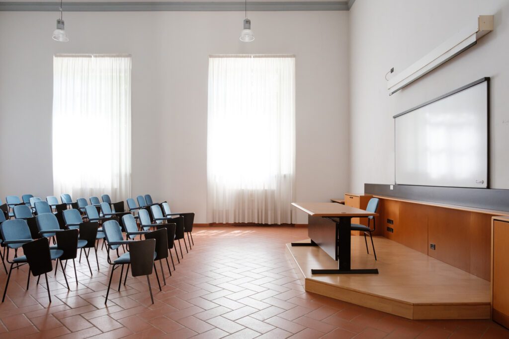 Aula 6 1 di 5 Ubicazione e accessibilità Piano terra. Platea e palco accessibili Capienza e dimensioni 50 posti. Platea con sedie con tavolino a ribaltina, scrivania relatore Attrezzature Possibilità di telo e proiettore mobile Scarica la scheda tecnica Contattaci