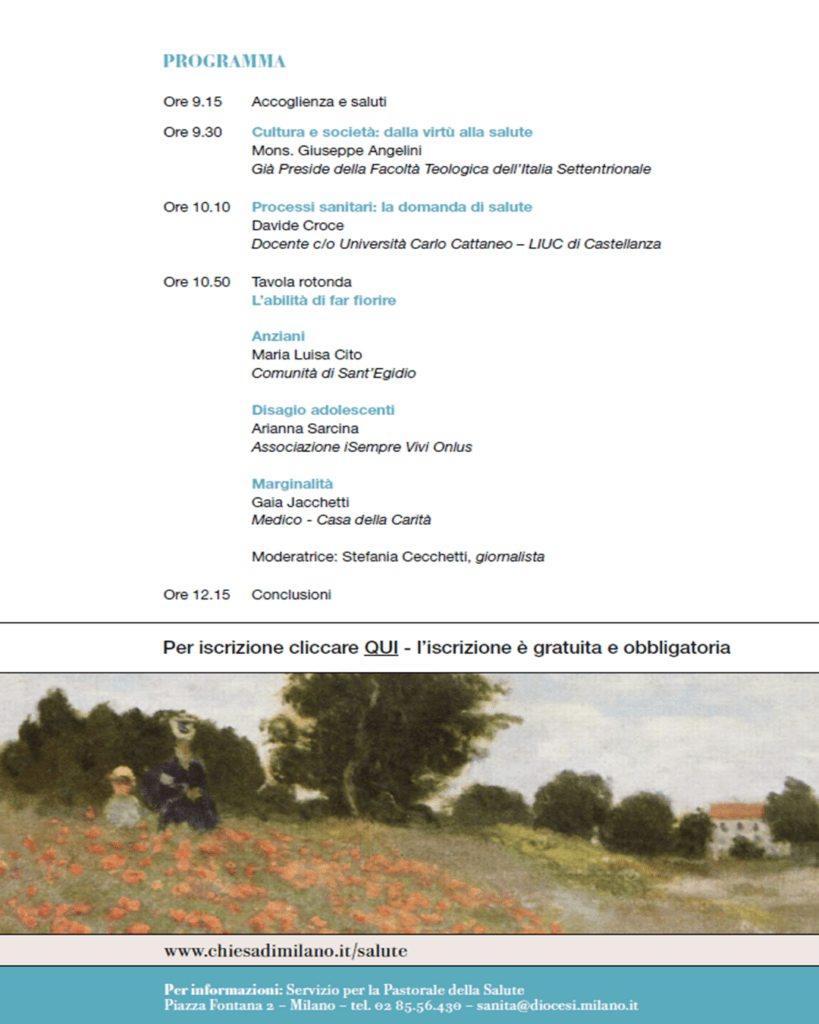 Condurre una vita buona significa toccare in profondità quanto rende possibile la “fioritura dell’uomo”, cioè quanto consente all’uomo di essere pienamente uomo. La fioritura si dispiega nel tempo ed il protagonista di tale cammino è sempre un uomo consapevole del fatto che solo dirigendosi verso il raggiungimento dei beni comuni sarà in grado di conseguire anche il proprio bene autentico. Quale orientamento dare, dunque, alle grandi questioni della salute? Come la cultura e la vita sociale incanalano domande e desideri di salute?